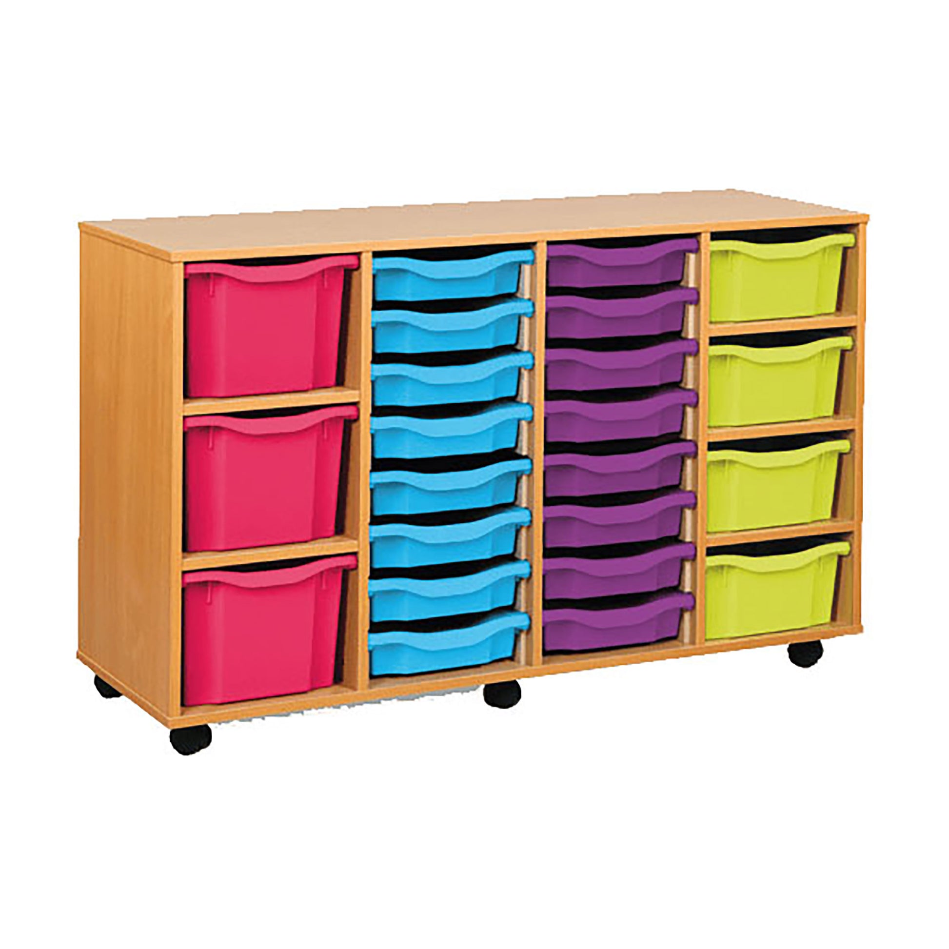 Keep classrooms organised and clutter-free with this versatile mobile tray storage unit. Designed for both practicality and durability, it features a robust beech-finish carcass made from 18mm MFC with protective PVC edging. Supplied with a colourful assortment of Gratnell trays in various sizes, it's ideal for storing everything from stationery and crafts to larger learning resources. With smooth-gliding castors—two of which lock for added stability—this unit offers flexible, long-lasting storage that adapts to your space.